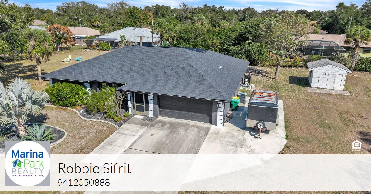 Perfectly situated on a sprawling half-acre double lot, this beautifully maintained 3-bedroom, 2-bathroom, 2 car garage pool home offers over 2,000 total square feet of living space. The expansive lot provides plenty of open space, including a dedicated parking pad for an RV, boat, trailer, or extra vehicles. With room to spread out, space for all your toys, and a sparkling pool at the heart of the property, this home effortlessly combines comfortable indoor living with outdoor freedom in a tranquil neighborhood setting. Step inside to a bright, open floor plan featuring vaulted ceilings and wood flooring in the living and dining areas. Sliding glass doors open directly to the lanai and pool, creating the perfect space for indoor-outdoor entertaining. The kitchen is a true centerpiece, with stainless steel appliances, raised panel hardwood cabinetry, ample storage, a breakfast bar, pantry closet, and a dinette area overlooking the pool. The adjacent family room boasts a custom coffee and beverage bar that serves as a striking focal point. Featuring crisp white cabinetry, a vibrant blue tile backsplash, accent lighting, dual-zone beverage cooler, and dedicated counter space, this built-in station is both stylish and highly functional—perfect for morning coffee or evening cocktails. Retreat to a spacious primary suite featuring bold designer accent walls, elegant crown molding, and wide-plank flooring that enhances the room’s modern, inviting feel. The generous layout easily accommodates large furnishings while multiple windows provide an abundance of natural light. Double doors open to a dedicated attached office or sitting room—perfect for remote work or quiet relaxation. From here, sliding glass doors lead directly to the pool area, creating a seamless indoor-outdoor connection to your private backyard oasis. The en-suite bathroom offers a spa-like experience with an extended granite-top dual-sink vanity, upgraded fixtures, and a beautifully tiled walk-in shower. Guest bedrooms are generously sized with built-in closets and convenient access to the full pool bathroom. Step outside to your screened-in pool oasis, featuring a sparkling heated pool with waterfall feature and spacious brick paver deck for lounging, entertaining, or simply enjoying the day. Relax and unwind in your heated spa. The lanai provides ample seating with ceiling fan. Updates include new roof in 2022, pool cage footer and slab extended 2021, A/C 2020. Shed in backyard for storage. Located in an established neighborhood and close to US-41, I-75, shopping, dining, hospitals, and top-rated parks and beaches ensures everyday convenience.