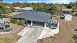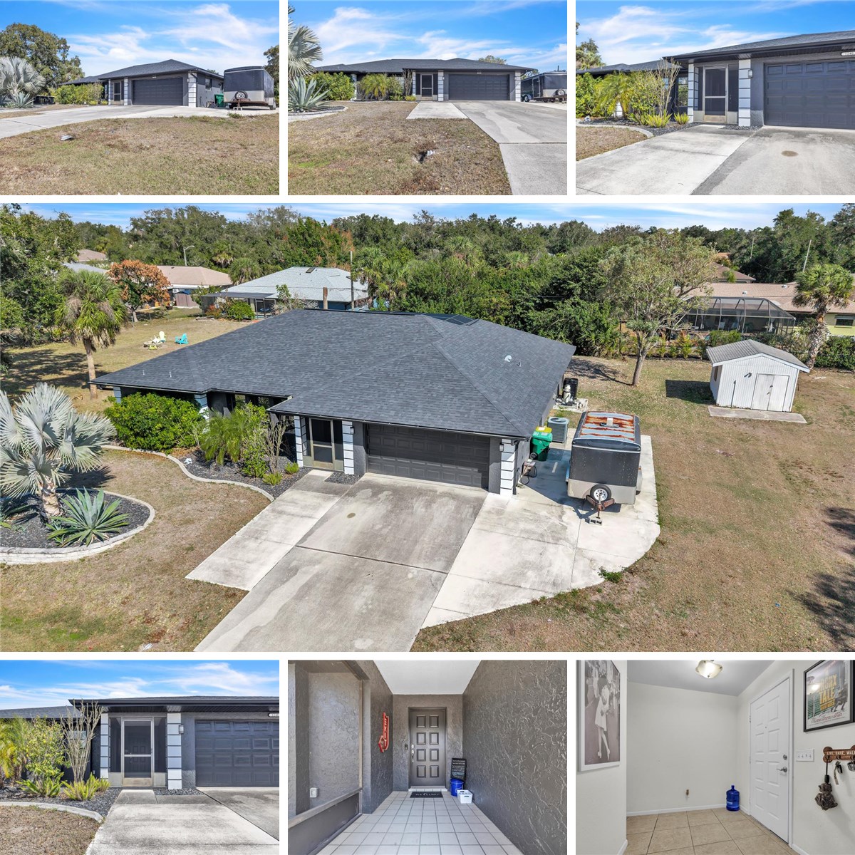 Perfectly situated on a sprawling half-acre double lot, this beautifully maintained 3-bedroom, 2-bathroom, 2 car garage pool home offers over 2,000 total square feet of living space. The expansive lot provides plenty of open space, including a dedicated parking pad for an RV, boat, trailer, or extra vehicles. With room to spread out, space for all your toys, and a sparkling pool at the heart of the property, this home effortlessly combines comfortable indoor living with outdoor freedom in a tranquil neighborhood setting. Step inside to a bright, open floor plan featuring vaulted ceilings and wood flooring in the living and dining areas. Sliding glass doors open directly to the lanai and pool, creating the perfect space for indoor-outdoor entertaining. The kitchen is a true centerpiece, with stainless steel appliances, raised panel hardwood cabinetry, ample storage, a breakfast bar, pantry closet, and a dinette area overlooking the pool. The adjacent family room boasts a custom coffee and beverage bar that serves as a striking focal point. Featuring crisp white cabinetry, a vibrant blue tile backsplash, accent lighting, dual-zone beverage cooler, and dedicated counter space, this built-in station is both stylish and highly functional—perfect for morning coffee or evening cocktails. Retreat to a spacious primary suite featuring bold designer accent walls, elegant crown molding, and wide-plank flooring that enhances the room’s modern, inviting feel. The generous layout easily accommodates large furnishings while multiple windows provide an abundance of natural light. Double doors open to a dedicated attached office or sitting room—perfect for remote work or quiet relaxation. From here, sliding glass doors lead directly to the pool area, creating a seamless indoor-outdoor connection to your private backyard oasis. The en-suite bathroom offers a spa-like experience with an extended granite-top dual-sink vanity, upgraded fixtures, and a beautifully tiled walk-in shower. Guest bedrooms are generously sized with built-in closets and convenient access to the full pool bathroom. Step outside to your screened-in pool oasis, featuring a sparkling heated pool with waterfall feature and spacious brick paver deck for lounging, entertaining, or simply enjoying the day. Relax and unwind in your heated spa. The lanai provides ample seating with ceiling fan. Updates include new roof in 2022, pool cage footer and slab extended 2021, A/C 2020. Shed in backyard for storage. Located in an established neighborhood and close to US-41, I-75, shopping, dining, hospitals, and top-rated parks and beaches ensures everyday convenience.