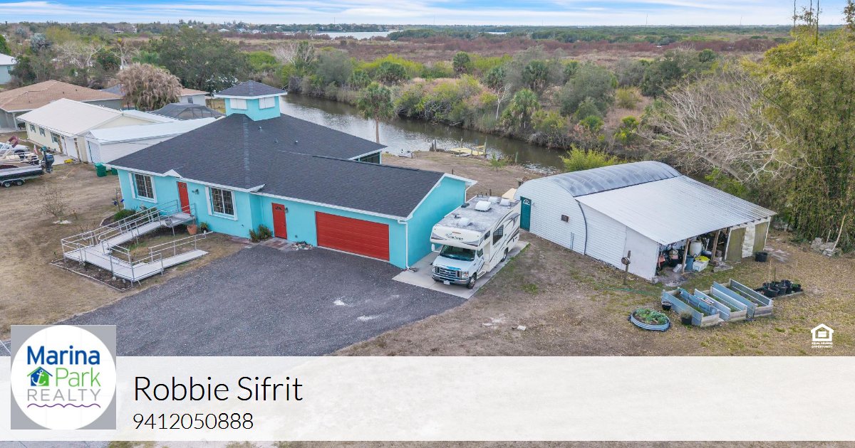Welcome to Your Private Riverfront Retreat in Peace River Shores! Experience true Florida living with peaceful water views, wide-open skies, and the serenity of a riverfront lifestyle. The home is elevated above standard grade, providing added protection and peace of mind against flooding. Situated on an oversized lot, this charming 3-bedroom, 1.5-bath home offers 1,485 square feet of living space and an attached 2-car garage—perfectly blending comfort, privacy, and waterfront charm. The single-story home greets you with a bright, coastal-inspired exterior. A soft blue façade pairs beautifully with bold red doors and a matching garage, creating a warm, inviting first impression. A distinctive cupola crowns the roof, adding character, while a new roof installed in 2023 ensures peace of mind. A handicap ramp at the front door provides easy accessibility for all. Boating and nature enthusiasts will love the 175 feet of river frontage, complete with a new 6x13 pressure-treated wood dock, ideal for fishing, kayaking, or launching a boat. You have direct access through Lake Jim Long onto the Peace River, Charlotte Harbor, and the Gulf of Mexico—an exceptional opportunity for boating and water lovers. The property also features a 450 square foot insulated Quonset Hut with electric, A/C, LED lighting and workbench on cement floor, perfect for hobbies, projects, or extra storage. Additionally, the 32x22 oversized garage provides abundant space for vehicles, tools, and seasonal equipment, featuring a hurricane-code garage door, shutters, and LED lighting for added convenience and safety. A 28x14 parking pad offers room for your RV, boat, or additional cars. Inside, the open-concept layout is perfect for both everyday living and entertaining. The inviting kitchen overlooks the living and dining areas and features creamy beadboard-style cabinetry with glass-front display cabinets, stainless steel appliances, ample counter space, and a convenient breakfast bar. A large window over the sink fills the space with natural light, while tile and wood laminate flooring flow seamlessly throughout. French doors off the dining area open to a spacious screened-in lanai, extending your living space for year-round relaxation and entertaining. The primary bedroom offers two walk-in closets, while the adjacent bath features a walk-in shower and jetted soaking tub. One guest bedroom includes a new half bath, while the other is currently used as a hobby room or home office, providing flexible options for your lifestyle. The laundry area, located off the bathroom, includes a washer and dryer (2021) and utility sink. The home also boasts hurricane impact windows, shutters, and a 2019 A/C unit. Just minutes from the Peace River, this home also offers optional access to the Peace River Shores Community Association, including a private boat ramp, clubhouse, park, and picnic area—all for a one-time $250 membership fee and just $75 per year thereafter. Conveniently located near downtown Punta Gorda, restaurants, shopping, Fishermen's Village, Gilchrist Park, boating, community events, and entertainment, with I-75 and US-41 just a short drive away, this location combines tranquility with accessibility. Don’t miss your chance to own a piece of paradise in this quiet, close-knit riverfront community!