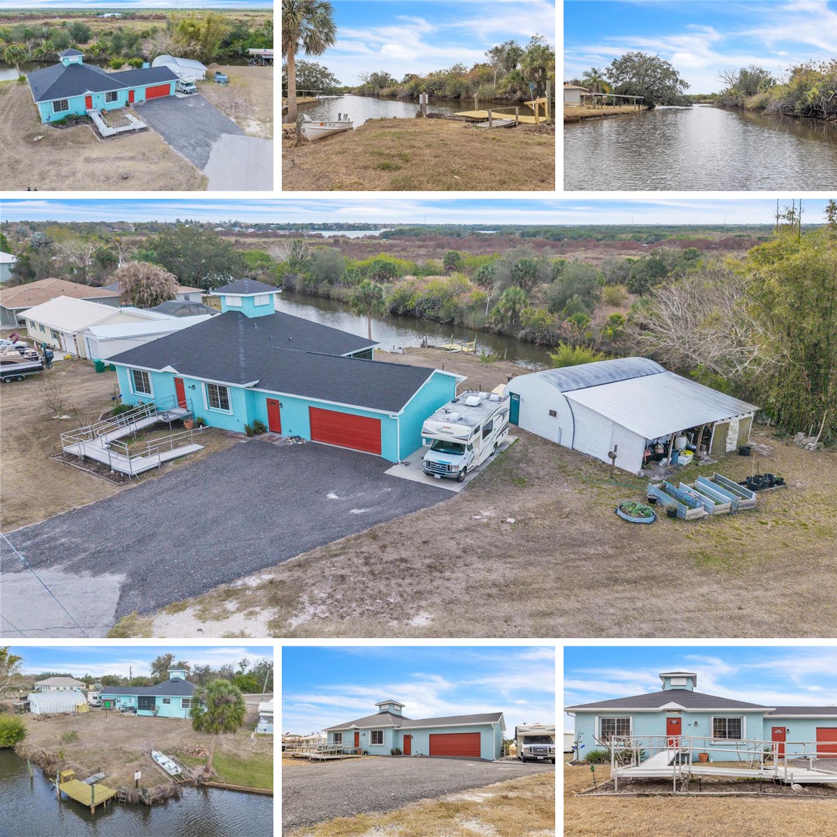 Welcome to Your Private Riverfront Retreat in Peace River Shores! Experience true Florida living with peaceful water views, wide-open skies, and the serenity of a riverfront lifestyle. The home is elevated above standard grade, providing added protection and peace of mind against flooding. Situated on an oversized lot, this charming 3-bedroom, 1.5-bath home offers 1,485 square feet of living space and an attached 2-car garage—perfectly blending comfort, privacy, and waterfront charm. The single-story home greets you with a bright, coastal-inspired exterior. A soft blue façade pairs beautifully with bold red doors and a matching garage, creating a warm, inviting first impression. A distinctive cupola crowns the roof, adding character, while a new roof installed in 2023 ensures peace of mind. A handicap ramp at the front door provides easy accessibility for all. Boating and nature enthusiasts will love the 175 feet of river frontage, complete with a new 6x13 pressure-treated wood dock, ideal for fishing, kayaking, or launching a boat. You have direct access through Lake Jim Long onto the Peace River, Charlotte Harbor, and the Gulf of Mexico—an exceptional opportunity for boating and water lovers. The property also features a 450 square foot insulated Quonset Hut with electric, A/C, LED lighting and workbench on cement floor, perfect for hobbies, projects, or extra storage. Additionally, the 32x22 oversized garage provides abundant space for vehicles, tools, and seasonal equipment, featuring a hurricane-code garage door, shutters, and LED lighting for added convenience and safety. A 28x14 parking pad offers room for your RV, boat, or additional cars. Inside, the open-concept layout is perfect for both everyday living and entertaining. The inviting kitchen overlooks the living and dining areas and features creamy beadboard-style cabinetry with glass-front display cabinets, stainless steel appliances, ample counter space, and a convenient breakfast bar. A large window over the sink fills the space with natural light, while tile and wood laminate flooring flow seamlessly throughout. French doors off the dining area open to a spacious screened-in lanai, extending your living space for year-round relaxation and entertaining. The primary bedroom offers two walk-in closets, while the adjacent bath features a walk-in shower and jetted soaking tub. One guest bedroom includes a new half bath, while the other is currently used as a hobby room or home office, providing flexible options for your lifestyle. The laundry area, located off the bathroom, includes a washer and dryer (2021) and utility sink. The home also boasts hurricane impact windows, shutters, and a 2019 A/C unit. Just minutes from the Peace River, this home also offers optional access to the Peace River Shores Community Association, including a private boat ramp, clubhouse, park, and picnic area—all for a one-time $250 membership fee and just $75 per year thereafter. Conveniently located near downtown Punta Gorda, restaurants, shopping, Fishermen's Village, Gilchrist Park, boating, community events, and entertainment, with I-75 and US-41 just a short drive away, this location combines tranquility with accessibility. Don’t miss your chance to own a piece of paradise in this quiet, close-knit riverfront community!
