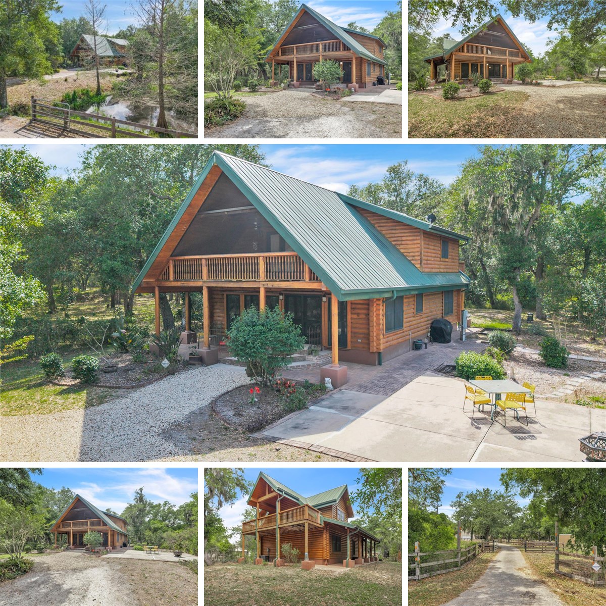 Tucked away on five serene acres, this distinctive two-story A-frame log cabin offers a rare blend of rustic charm and refined finishes, paired with an expansive barn and additional outbuildings for ultimate versatility. Built in 2008, the home features an open-concept first floor where the living, dining, and kitchen areas flow seamlessly, showcasing true log-cabin craftsmanship. Exposed wood beams, soaring ceilings, natural wood flooring, and expansive windows fill the interior with abundant natural light, creating a cozy yet airy ambiance. The well-appointed kitchen is a chef’s dream, with custom wood cabinetry, elegant marble countertops, a decorative tile backsplash, a gas cooktop, built-in convection oven, and a center island with bar seating—perfect for entertaining. Durable tile flooring throughout the kitchen and dining areas adds both style and easy maintenance. French doors open to the outdoor living space, ideal for enjoying the peaceful, private surroundings. The main level also offers two generously sized guest bedrooms with built-in closets and luxury vinyl flooring, a thoughtfully designed guest bathroom with a walk-in shower and marble-top vanity, and a conveniently located laundry room. Upstairs, a spacious loft-style family room opens to a charming front balcony overlooking the expansive front yard. The primary suite features a cedar walk-in closet, a private balcony with views of the backyard and natural landscape, and an updated spa-like bathroom with natural wood ceilings, exposed beams, a custom double vanity, and a large glass-enclosed walk-in shower with floor-to-ceiling tile and abundant natural light. Adding to the property’s appeal, a gated front driveway first leads to the barn before veering to the home, offering exceptional privacy. The 2,000+ square-foot barn includes a small efficiency apartment and multiple versatile rooms, while a detached building provides additional space for storage or a workshop. Although there is no traditional garage, the barn and other structures could accommodate a carport or covered parking. This property seamlessly combines the warmth and character of a log cabin with functional, flexible outbuildings on five acres of privacy—perfect for those seeking a unique retreat, hobby farm, or versatile estate. Located on a peaceful lot in Arcadia, this home offers the perfect balance of privacy and convenience. This property is zoned A-10, offering the perfect setting to bring your horses, raise other livestock, or start a hobby farm. With plenty of space for barns, paddocks, and outdoor activities, it’s ideal for enjoying the rural lifestyle while still being just minutes from downtown Arcadia and easy access to Punta Gorda. Create your private country retreat and take advantage of the freedom and flexibility that A-10 zoning provides. Just minutes from downtown Arcadia, you’ll enjoy easy access to grocery shopping at Publix and Walmart, local favorites like Slim’s Bar-B-Q and Brother’s Fish House, and a variety of casual dining options. Families will appreciate nearby West Elementary, DeSoto Middle, and DeSoto County High School, while outdoor enthusiasts can explore Morgan Park, the Peace River, and local trails for boating, fishing, and picnicking. Enjoy easy access to Punta Gorda, making commuting, shopping, and entertainment simple while still enjoying the charm of a rural retreat.