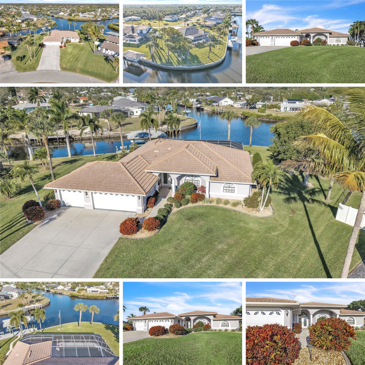 Perfectly positioned on a spectacular tip lot, this luxury waterfront pool home captures breathtaking panoramic views of intersecting canals from nearly every room. With three bedrooms, two and a half baths, and a three-car garage, the property rests on over half an acre of premium saltwater frontage and boasts 202 feet of concrete seawall. Ideal for boating enthusiasts, it includes a 40-foot composite dock, a covered boat lift with water and electric, and a fish light, all just minutes from Charlotte Harbor with direct access to the Gulf of Mexico. This tropical retreat features more than 2,200 square feet of thoughtfully designed living space enhanced by numerous upgrades and four separate entry points to the expanded pool patio, creating seamless indoor-outdoor living. The grand pillared double-door entry immediately draws the eye to the sparkling pool and impressive water vistas that define the home. The open-concept living area offers high ceilings, large tile flooring, and an abundance of natural light flowing through expansive sliding glass doors. The dining and living spaces blend effortlessly with the beautifully appointed kitchen, which features granite countertops, a tiled backsplash, raised-panel cabinetry with pull-out drawers, accent lighting, stainless-steel appliances, a built-in glass-top stove, a pantry closet, and a generous breakfast bar overlooking the breakfast nook. Adjacent to the kitchen, the warm and inviting family room showcases wood flooring and sliding glass doors that open directly to the pool lanai, providing the perfect setting for casual gatherings or quiet evenings with serene water views. The primary suite is a spacious sanctuary with French doors leading to the pool deck, two large walk-in closets, and a spa-inspired bathroom complete with dual sinks, a garden tub, and a Roman shower with custom tile details and built-in seating. On the opposite side of the home, two private guest bedrooms feature plush carpeting, tray ceilings, and built-in closets. They are conveniently situated near a beautifully finished bathroom with a walk-in tiled shower, creating a comfortable and functional guest wing. Stepping outside reveals a stunning waterfront oasis designed for relaxation and entertaining. The covered lanai is enhanced with ceiling fans for year-round comfort, while the resurfaced heated saltwater pool sits within an oversized screened enclosure offering abundant space for lounging and sunning. A convenient pool bath adds to the practicality of this exceptional outdoor retreat. Additional enhancements include a new A/C system installed in 2025, a 2020 water heater, central vacuum, security system, humidistat, irrigation well, water softener, reverse osmosis system, hurricane shutters, and a lighted flagpole. The upgraded landscaping, mature palms, and a double-wide driveway with ample room for both an RV and a boat complete the appeal of this extraordinary waterfront estate. Centrally located near shopping, dining, schools, golf courses, beautiful Gulf beaches, and major roadways including US-41 and I-75.
