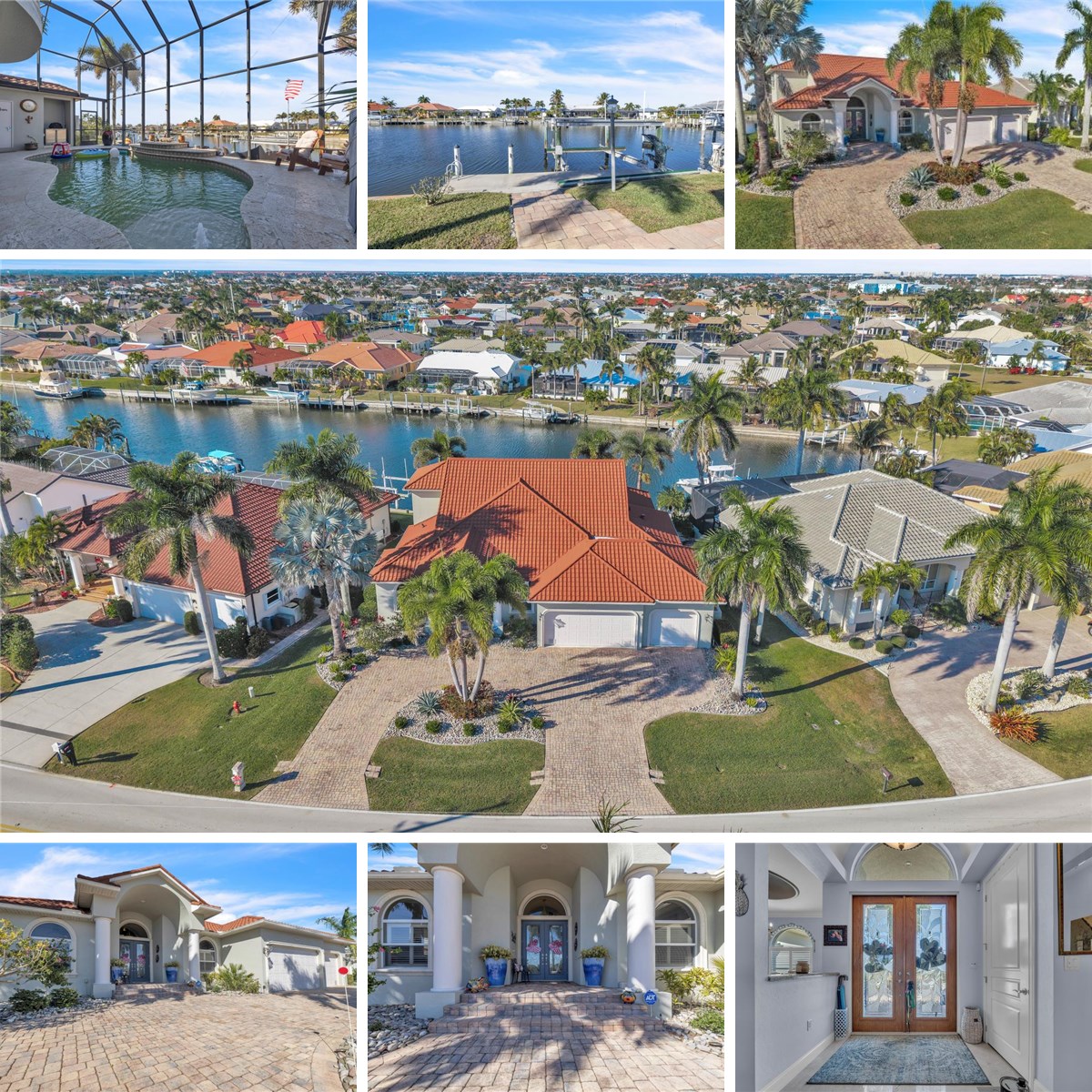 Exceptional sailboat-access waterfront residence offering 5 bedrooms, 3.5 bathrooms, a 3-car garage, a heated pool, private dock with boat lift, and NO HOA FEES. Thoughtfully designed for both elegance and functionality, this expansive home features three bedrooms and two full baths on the main living level—ideal for everyday comfort and multigenerational living. Extensive recent upgrades provide peace of mind and modern appeal, including a new tile roof (2024), new landscaping (2024), Generac whole-house generator (2025), tankless water heater (2024), ADT security system (2024), new washer (2025), and one of two A/C systems replaced (2025). The home has been completely repainted inside and out, and features new waterproof laminate flooring throughout, with stairs reconfigured and finished with wood treads. The travertine flooring was professionally stripped and resealed in 2025, and the lanai surface was stripped and cleaned in 2026. Outstanding exterior features include a paver circular driveway, 35’ concrete dock, 24,000-lb boat lift with two new motors (2025), quick minutes-to-open-water access, impact windows with accordion shutters, and a whole-home water purification system. Inside, the bright and open floor plan is enhanced by Italian marble flooring, crown molding, recessed lighting, and expansive windows showcasing breathtaking sunset and water views. The spacious living and dining areas create the perfect setting for entertaining. The gourmet kitchen has been refreshed with new quartz countertops, a new kitchen sink, abundant cabinetry, electric cooktop, dual convection oven/microwave, Sub-Zero cabinet-front refrigerator, walk-in pantry, breakfast bar, reverse osmosis system, and a charming dining nook with aquarium windows for scenic waterfront dining. The primary suite offers a private retreat with tray ceiling, engineered hardwood flooring, his-and-hers walk-in closets, and direct lanai and pool access. The en-suite bath features a dual-sink quartz vanity, soaking tub, fully tiled walk-in shower with bench, linen closet, water closet, and convenient laundry access. Two guest bedrooms on the main level provide privacy with a split-bedroom layout, while upstairs offers a sitting area with balcony access and two additional bedrooms sharing a full bath. Outdoors, enjoy an expansive waterfront lanai surrounded by lush tropical landscaping, a heated pool with waterfall feature, paver seating areas, and an air-conditioned pool bath—ideal for relaxing or entertaining. Boating enthusiasts will appreciate effortless access to Charlotte Harbor and beyond. Ideally located near Fisherman’s Village, Ponce de Leon Park, Gilchrist Park, and historic downtown Punta Gorda, with easy access to boating, biking, dining, live entertainment, and award-winning Gulf beaches including Englewood Beach, Manasota Key, and Stump Pass.