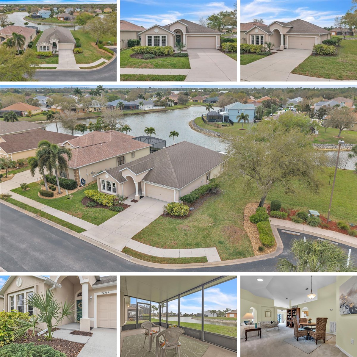 Welcome to this spacious 4-bedroom, 2-bath, 2-car garage home in the desirable gated community of Suncoast Lakes. What truly sets this property apart is its prime location within the community—situated adjacent to the pool with a park-like setting, it offers a perfect place to relax with friends and neighbors. The home has 2,015 square feet of living space with an open floor plan featuring soaring ceilings and abundant natural light, creating a bright, airy atmosphere perfect for both everyday living and entertaining. Step inside to a formal living and dining area accented by plush carpeting and dramatic ceiling heights. Carpeted flooring flows throughout the main living areas and all bedrooms, adding warmth and continuity, while elegant arched doorways enhance the home’s architectural appeal. The well-appointed kitchen offers rich wood cabinetry, a full suite of white appliances, and a cozy breakfast nook for casual dining. Overlooking the family room, the kitchen seamlessly connects to the outdoors through sliding glass doors that open to the lanai, showcasing tranquil lake views. A convenient laundry room is located just off the kitchen. The spacious primary suite features high ceilings and peaceful lake views, along with a large, mirrored storage closet that adds both function and an open feel. The en-suite bath includes dual vanities, a relaxing garden tub, and a separate walk-in shower. Three additional guest bedrooms are generously sized and share a full bath. The fourth bedroom, also with lake views, is ideal as a child’s room, playroom, home office, or den. Enjoy Florida living at its best from the 19x9 screened lanai overlooking the serene lake—perfect for morning coffee or entertaining guests. Additional highlights include a new roof (March 2026) featuring GAF Timberline HDZ shingles with a TRANSFERRABLE Golden Pledge Warranty, providing both peace of mind and long-term value, a new water heater (2025), Eurex hurricane shutters, and mature landscaping with irrigation. The home is ideally situated at the end of a cul-de-sac and just a short walk to the community pool. Suncoast Lakes is a clean, quiet, pet-friendly community designed for an active lifestyle, offering a gated entry, community pool, park/playground, irrigation water, cable TV, and trash service. Conveniently located near golf courses, shopping, and schools—and just minutes from historic downtown Punta Gorda, where you’ll enjoy dining, entertainment, boating, and world-class fishing. Plus, you’re less than an hour from Florida’s beautiful Gulf beaches, making it easy to enjoy sun-soaked days on the coast.