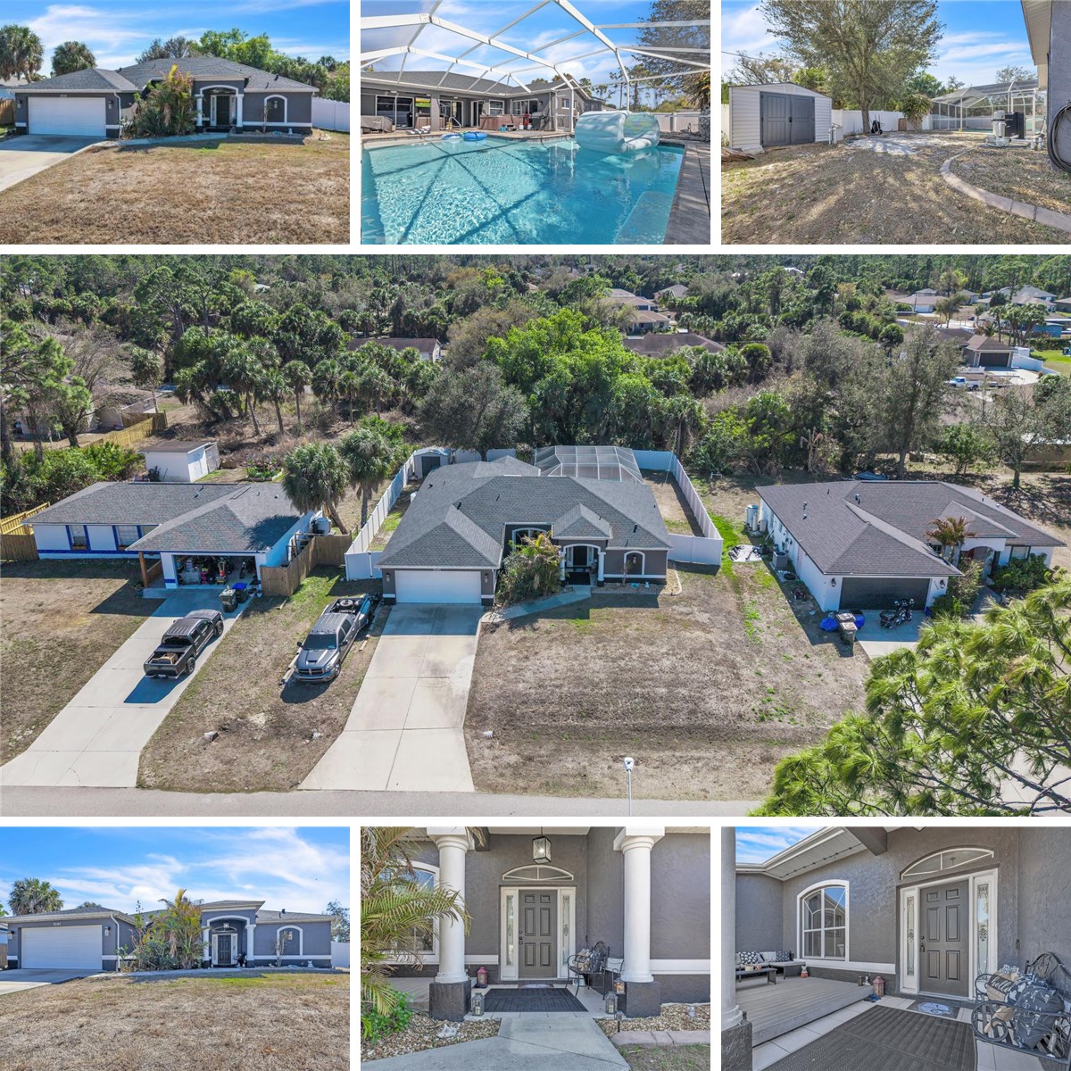 Beautifully maintained 3-bedroom, 2-bathroom pool home with a 2-car garage, offering 1,858 square feet of thoughtfully designed living space and a desirable split-bedroom floor plan that perfectly blends comfort, functionality, and style. Recent updates provide added peace of mind and include interior and exterior repainting, a whole-house reverse osmosis system installed in 2024, a new roof in 2022, and a new A/C system in 2024. Inside, the bright and open layout is ideal for both everyday living and entertaining. Cathedral ceilings and tile flooring flow throughout the home, creating a spacious, airy feel and a clean, cohesive look that is both stylish and easy to maintain. Multiple living spaces—including the living room, dining room, and family room—feature sliding glass doors that open directly to the pool area, filling the home with natural light while creating seamless indoor-outdoor living. Step outside to your own private backyard oasis. The screened pool area features a sparkling heated pool with new lighting, a Pentair variable-speed pool pump installed in 2025, and a new pool cage added in 2023. The covered lanai with ceiling fans and a relaxing hot tub provides the perfect setting for entertaining or unwinding after a long day. The fully fenced backyard offers privacy and security, making it ideal for pets, play, or simply enjoying your own outdoor retreat. At the heart of the home, the stylish kitchen is designed to be both functional and inviting. A large island with granite countertops, modern pendant lighting, and seating for four creates the perfect gathering space for casual meals and conversation. White cabinetry is complemented by a striking geometric backsplash, while new stainless-steel appliances and a deep farmhouse sink add both beauty and practicality. The laundry room located just off the kitchen provides additional storage and keeps daily tasks conveniently tucked away. The spacious owner’s suite serves as a private retreat with sliding doors that open directly to the pool area. The ensuite bathroom features dual vessel sinks set atop a granite vanity with ample storage and an impressive walk-in shower with oversized subway tile and sleek frameless glass doors, creating a spa-like atmosphere. The guest bedrooms are generously sized, each offering built-in closets, large industrial-style ceiling fans, and easy access to the fully updated guest bathroom, renovated in 2025. The home offers quick access to shopping, dining, major retailers, and a variety of local restaurants. Gulf beaches are approximately 25 minutes away, while Centennial Park’s Olympic-size swimming pool is only about 10 minutes from the home. Charlotte Sports Park, the county fairgrounds, numerous parks, and multiple boat launches are all within a short 15-minute drive. With its inviting layout, modern updates, and fantastic location, this North Port pool home offers the perfect opportunity to enjoy the Florida lifestyle.