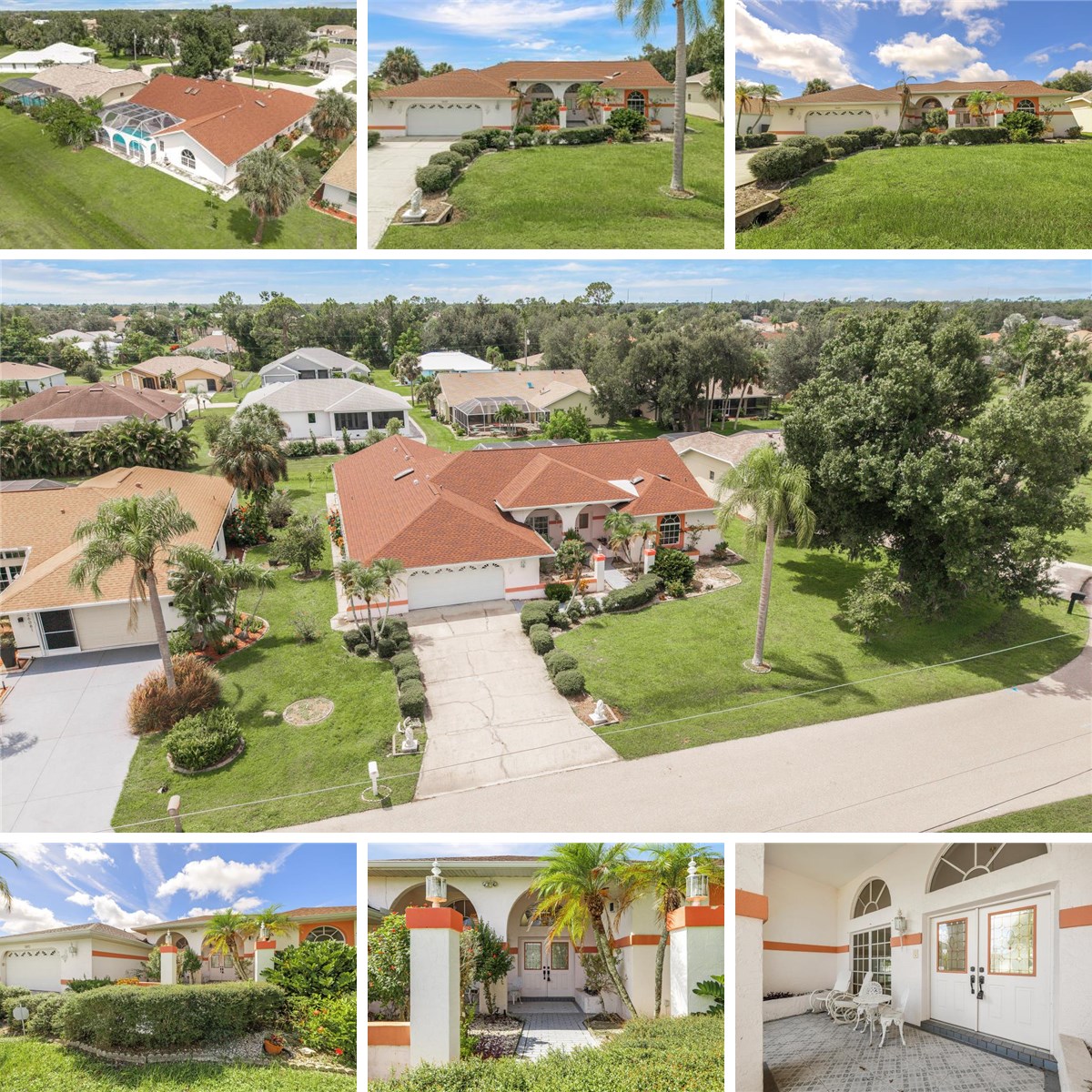 Welcome to this bright and airy residence in the highly sought-after, deed-restricted community of Deep Creek. Offering 2,943 square feet of living space, this beautifully appointed home features 3 bedrooms, 3 bathrooms, and an oversized 2-car garage, perfectly situated on a quiet cul-de-sac lot with serene greenbelt views. From the moment you arrive, the curb appeal shines with lush landscaping, vibrant greenery, and a classic arched front porch with covered entry. The exterior reflects timeless Florida style with a stucco finish, decorative trim, and an extended driveway leading to the garage. Large front windows and a striking double-arched entry allow natural light to pour inside, setting the tone for what’s to come. Step into the expansive living room where soaring ceilings with skylights, elegant chandeliers, and marble-look tile flooring create a sense of grandeur. Wide sliding glass doors open to the lanai and pool, blending indoor and outdoor living seamlessly. The open-concept layout continues into the family room, dining area, and kitchen. The dining space includes a built-in wet bar—ideal for entertaining—while the kitchen offers a central island with cooktop, built-in stainless oven and microwave, abundant cabinetry, and generous counter space. Sliding glass doors invite even more natural light and provide direct outdoor access. The private primary suite boasts double-door entry, plush carpeting, pool access, walk-in closet, dual-sink vanity, walk-in shower, jetted soaking tub, bidet, and linen closet. The two guest bedrooms share a convenient Jack and Jill bathroom. Outdoors, a spacious covered lanai with ceiling fans overlooks the screened pool area featuring a sparkling pool with waterfall, brick paver decking, and access to a dedicated pool bath with shower. Additional highlights include laundry room with washer and dryer, hurricane shutters, plus a new roof and skylights installed in 2023. Ideally located just minutes from golf, shopping, dining, entertainment, I-75, medical facilities, and waterfront parks, this home combines comfort, style, and convenience—perfect for year-round living or seasonal retreats.