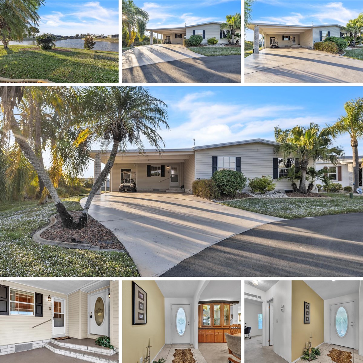 TURNKEY FURNISHED, GOLF CART INCLUDED! Welcome to this beautiful lakefront 2-bedroom, 2-bath manufactured home with a den/office located in the highly sought-after 55+ community of Ventura Lakes. Situated on a leased lot at the end of a quiet cul-de-sac, the home offers privacy, serene water views, and exceptional curb appeal with tropical landscaping and mature palm trees. Outside features an oversized driveway with covered parking for two vehicles plus additional space for a golf cart, combining convenience and functionality. Inside, the light-filled, open floor plan is perfect for both everyday living and entertaining. The spacious living area features large windows showcasing peaceful lake views, neutral carpeting, a ceiling fan, and warm wall tones. An adjacent dining room flows seamlessly into a large kitchen with tiled floors, skylighting, stainless-steel appliances, abundant raised-panel cabinetry, generous counter space, a center island with seating, a walk-in pantry, and a cozy dinette area. The sellers thoughtfully added a convenient door from the primary bathroom directly into the kitchen, enhancing accessibility and functionality. Off the kitchen, the laundry room includes a washer, dryer, sink, and ample storage space. The primary suite features plush carpeting, slider access to the Florida room, a huge walk-in closet, and an attached bath with a walk-in shower, extended dual-sink vanity, and abundant storage. The guest bedroom is carpeted with large built-in closets and access to a full bathroom. The office/den offers versatile space and could easily function as a third bedroom. This stunning Florida room offers a bright and airy retreat with panoramic views of a serene lake. Surrounded by large windows, the space is bathed in natural light, creating a warm and inviting atmosphere. The wicker furniture set, complete with a round dining table and comfortable armchairs, adds a touch of coastal charm—perfect for relaxing or entertaining guests. Neutral carpeting complements the crisp white walls and ceiling, while twin ceiling fans with wooden blades provide both style and comfort. Bamboo shades add texture and a tropical feel. Beyond the glass, lush greenery and sparkling water create a picturesque backdrop, making this Florida room an ideal spot to enjoy peaceful mornings or sunset views. Additional highlights include an attached storage shed, new A/C and water heater (2023), plantation shutters, generator, and golf cart—all conveying with the sale. Come enjoy resort-style living at its finest. Ventura Lakes offers a beautiful clubhouse with year-round planned activities, a swimming pool and hot tub, pickleball, tennis, mini golf, shuffleboard, bocce ball, and horseshoes. Located in the charming city of Punta Gorda—voted one of the best places to retire in Southwest Florida—residents enjoy easy access to dining, shopping, medical facilities, golf, boating, Gulf beaches, world-class fishing, I-75, and several regional and international airports.