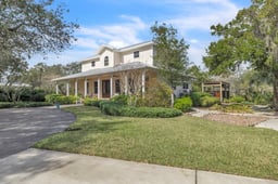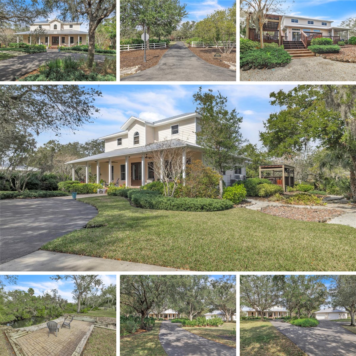 Welcome to your private oasis along Alligator Creek, where natural beauty meets everyday convenience. This picturesque custom built 3.43-acre property is nestled in a quiet rural community with paved roads, offering a rare combination of privacy and easy access to modern amenities. A long driveway, framed by majestic oak trees, leads to a serene, secluded setting that feels worlds away—yet is just minutes from shopping, dining, and the charm of downtown. The property includes a new metal roof (2023), a 1,000 sq. ft. steel building, and a 1,080 sq. ft. two-door detached garage, providing ample space for storage, a workshop, or hobbies. The impressive two-story residence offers 3,466 sq. ft. of living space with 3 bedrooms and 3.5 bathrooms, delivering generous room for both everyday living and entertaining. A spacious front porch supported by classic white columns create a warm & inviting first impression. The porch provides plenty of space for outdoor seating, perfect for relaxing while enjoying the peaceful surroundings. Large double front doors serve as a striking focal point for the entryway. Inside, the open-concept living area blends modern comfort with warm, natural finishes. Floor-to-ceiling windows/sliding doors along the back wall flood the space with natural light while framing serene views of the greenery beyond. A sleek fireplace adds both style and functionality, while the dining area, accented by elegant lighting, is perfectly positioned to take advantage of the expansive outdoor vistas. The modern chef’s kitchen features warm wood cabinetry, stainless steel appliances, large center island with gas cooktop & vent hood, exotic granite countertops, stylish pendant lighting, and a walk-in pantry conveniently located off the laundry room. The first floor also includes a private office and a convenient half bath, ideal for guests or work-from-home needs. The primary suite is conveniently located on the main floor and offers French doors opening to a screened-in section of the back deck, a custom walk-in closet, and a luxurious spa-inspired bathroom. This master bath combines sophisticated design with contemporary finishes: a spacious walk-in shower anchors the room, featuring floor-to-ceiling tile, decorative mosaic accents. Opposite the shower, a freestanding soaking tub rests against a rich wood accent wall. The extended vanity offers abundant storage with beautifully crafted dark wood cabinetry and sleek countertops, complemented by pendant lights and large mirrors that enhance the room’s brightness. The second floor opens to a bright family room with an attached bonus room, perfect for a media area, playroom, or additional office space. Two additional bedrooms are carpeted, each featuring its own walk-in closet and en-suite bathroom with walk-in shower, providing comfort and privacy for family or guests. Outdoor living is a true highlight of this home. The back deck features a covered pergola area and a screened-in section off the primary bedroom, all overlooking an expansive backyard. Meandering pathways lead down to the waterfront, where patio areas and a firepit create the perfect setting for entertaining or relaxing while enjoying the tranquil water views. Whether you’re seeking a tranquil waterside retreat, a private homestead, or a property with room to expand, this rare offering delivers the perfect balance of serenity, functionality.