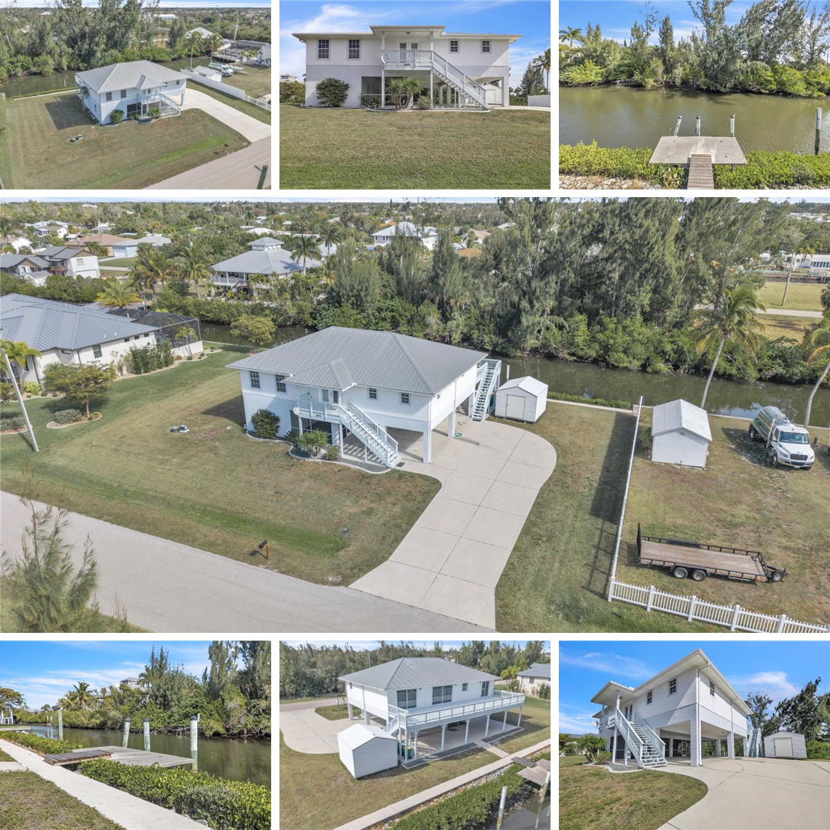 This elevated Key West-style three-bedroom, two-bath waterfront home offers 1,855 square feet of living space and a clean, modern exterior designed for both comfort and functionality. Ideally situated on the Venice Canal, the property provides direct boating access to Charlotte Harbor and the Gulf of Mexico, making it a true paradise for boating and water enthusiasts. Set on a generously sized lot, the home features an expansive concrete driveway with ample parking for multiple vehicles, boats, or recreational toys. The raised main living area enhances peace of mind while creating a breezy, open feel below—perfect for shaded outdoor seating, storage, or future entertaining space. The exterior showcases a crisp, neutral color palette with low-maintenance finishes and wide staircases leading to the upper level. Multiple entry points add convenience, while the open ground-level area offers flexible space ready to be customized to suit your lifestyle. A detached storage shed provides additional storage for tools, lawn equipment, or water gear. Surrounded by mature greenery and peaceful canal views, this property delivers privacy, tranquility, and the ultimate Florida waterfront lifestyle—dock your boat, enjoy serene water views, and reach Charlotte Harbor and the Gulf with ease.