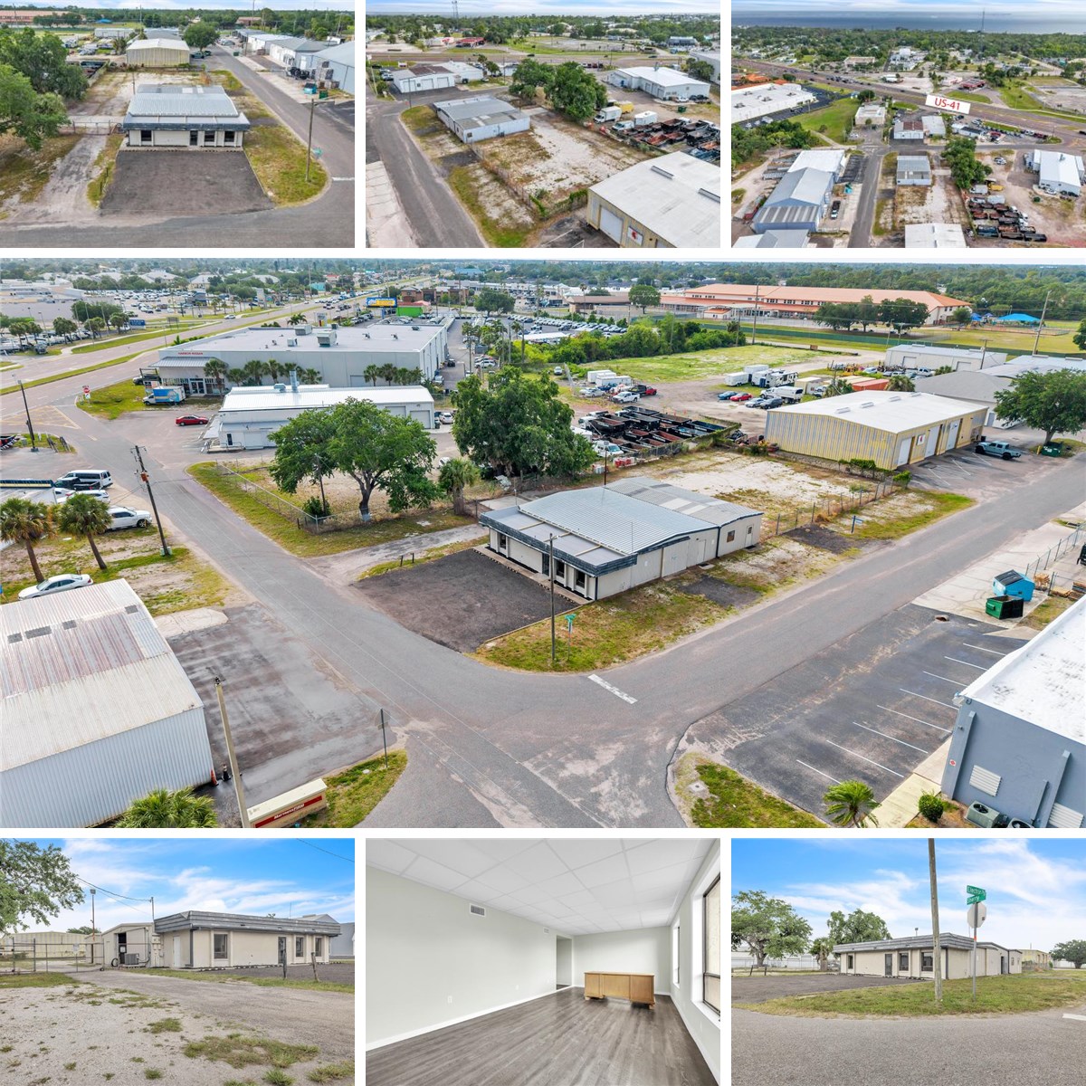 Corner Commercial Property with Office and Rear Metal Buildings in Harbor Executive Park! This 3,500+ square foot commercial property is ideally situated on a prominent corner lot within Harbor Executive Park, offering excellent visibility and dual street frontage. The property is currently vacant, allowing for immediate owner-user occupancy or lease-up. The site features a front office building positioned along the street, providing a professional presence for administrative or customer-facing functions, along with metal buildings located to the rear of the property that support warehouse, storage, or operational use. This layout offers a practical separation between office and industrial components, enhancing functionality for a wide variety of business operations. Zoned Industrial General, the property allows for numerous permitted uses including warehouse, storage facility, distribution center, trucking terminal, or other compatible industrial and service-oriented uses (subject to applicable approvals). The aerial perspective highlights a clearly defined corner parcel with roadway access from two sides and a generous open yard area, suitable for parking, outdoor storage, vehicle circulation, or future expansion. The property is served by public water and sewer, supporting a broad range of commercial uses. Surrounding properties reflect an established industrial and commercial environment.