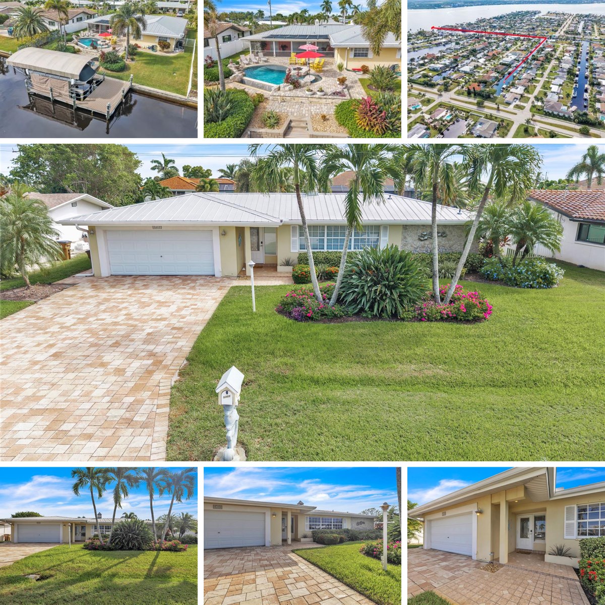 Experience the quintessential Florida lifestyle in this meticulously maintained, turnkey home located in the highly desirable Yacht Club neighborhood of Cape Coral. This residence offers 3 bedrooms and 2 bathrooms on a prime waterfront lot, complete with a sparkling heated pool for year-round enjoyment and direct open water access in just minutes. The exterior impresses with a durable metal roof, wide paver driveway leading to a 2 car garage and lush tropical landscaping with mature palms and colorful blooms. Expansive windows fill the interior with natural light, while manicured lawn enhances the home’s inviting curb appeal. Inside, a bright and airy open floor plan welcomes you. The living area features a stylish tray ceiling with recessed lighting and a ceiling fan, creating a sophisticated yet comfortable atmosphere. A 34x12 screened porch off the living room opens directly to the pool area, seamlessly connecting indoor and outdoor living spaces—perfect for entertaining or enjoying Florida’s beautiful weather. Neutral tile flooring flows throughout, unifying the space. The beautifully designed kitchen overlooks the dining and living areas, offering an open and inviting space ideal for entertaining. Stunning granite countertops extend into the backsplash for a seamless, upscale look. Custom white cabinetry provides ample storage, while stainless steel appliances, including a built-in microwave and oven, combine convenience with style. A large breakfast bar with pendant lighting and seating for three offers a casual dining option. Tray ceiling details and a tropical-inspired ceiling fan complete the sophisticated design, making this kitchen the centerpiece of the home. The generous primary suite offers private pool and lanai access, a large walk-in closet, and a luxurious bathroom with a walk-in shower and granite vanity with a bowl-style sink. One guest bedroom also provides direct pool access, while both guest bedrooms share an incredible full bathroom featuring a walk-in shower and a spa-like jetted bathtub—perfect for relaxation. The laundry room is thoughtfully designed with a front-loading washer and dryer, a convenient sink, and extra storage space, adding both functionality and organization to daily living. The outdoor living space exemplifies the ultimate Florida lifestyle. A sparkling freeform pool with built-in fire pit and rock waterfall is surrounded by a brick paver deck and lush tropical landscaping. Brick paver pathways lead down to the waterfront deck, complete with a private boat dock and a 20,000 lb covered boat lift designed for a wide-beam vessel. The dock is equipped with water and electric, ideal for boating enthusiasts. Multiple seating areas, colorful Adirondack chairs under umbrellas, and swaying palms create a true resort-style retreat. Perfect for boating enthusiasts or anyone seeking a serene waterfront sanctuary, this home offers the ultimate combination of luxury, comfort, and the coveted Cape Coral lifestyle.